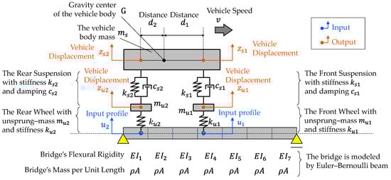 The adopted model and mechanical parameters of the VBI (vehicle–bridge interaction) system: The vehicle is assumed as an RBSM (rigid-body-spring model), while the bridge model is based on the Euler–Bernoulli theorem.