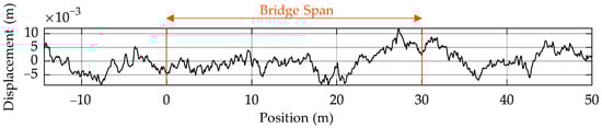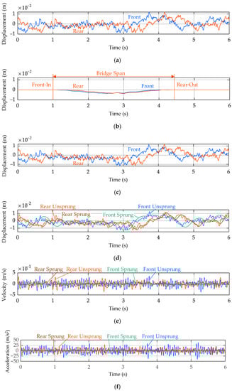 According to Figure 5a–c, the bridge profiles are much smaller than road profiles . Since the road profiles are predominant in the input profiles , road profiles predominantly affect the vehicle responses. The displacements of the unsprung-mass shown in Figure 5d are similar to the input profiles . Furthermore, the tendency of sprung-mass responses and unsprung-mass responses are similar.
