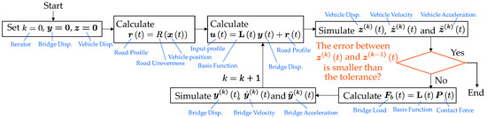 The parameters of the numerical simulation are shown in Table 4. The dynamic simulation is performed by the Newmark-beta method [36]. The time increment is 0.001. Since VBI system is generally non-linear and convergence calculation is needed, the iterative tolerance is set at 0.001. The adopted finite element model of the bridge consists of 7 beam elements. The algorithm of PRE simulation is shown in Figure 4. In the numerical simulation, the vehicle starts running from (), and the road profiles generate vehicle vibrations. When the front wheel enters the bridge (), the interaction between the vehicle and the bridge starts working. The interaction ends when the rear wheel reaches the end of the bridge span (). The vehicle vibration observed while passing through the bridge includes information about the bridge.