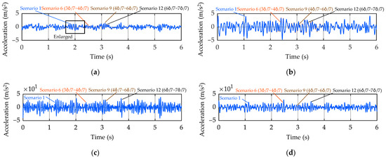 The vehicle vibration accelerations for each case: Scenario 1, Scenario 6, Scenario 9, and Scenario 12: (a): ; (b) ; (c) ; and (d) .