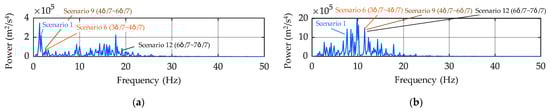 The Fourier’s power spectra of the vehicle vibration accelerations for each case: Scenario 1, Scenario 6, Scenario 9, and Scenario 12: (a) ; (b) ; (c) ; (d) . The differences between the obtained vibrations of the focused scenarios are tiny, even in the frequency domain.