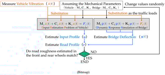 Therefore, the authors have extended their methods [26,27,28,29] and have proposed a novel scheme that can simultaneously estimate not only vehicle parameters but also bridge parameters. This scheme extension can be realized by adding a bridge simulation process. The extended method is called the PRE (numerical simulation-based vehicle and bridge parameter and road roughness estimation in VBI system) method [30,31,32] in this study. The uniqueness of the PRE method is that it includes the identification process of the bridge system.