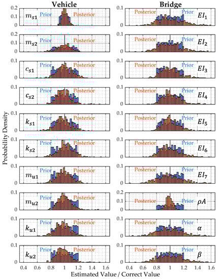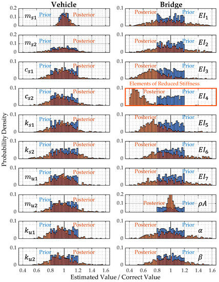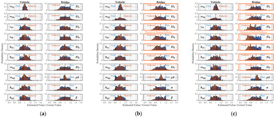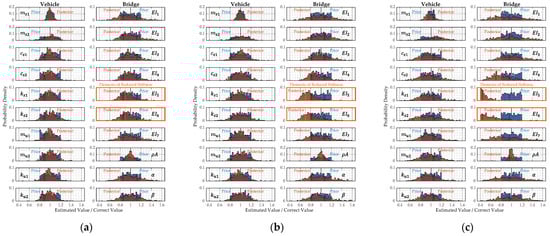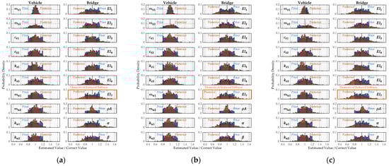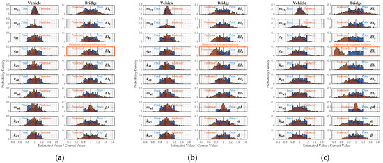 Figure 16 shows the probability density distributions of all estimated mechanical parameters in (a) Scenario 10, (b) Scenario, 11 and (c) Scenario 12, respectively. These cases indicate edge stiffness reduction. According to these figures, the tendency of stiffness reduction cannot be detected from the estimated distributions of . However, the next elements have underestimated values. This underestimation can help detect stiffness reduction at the bridge’s edge.