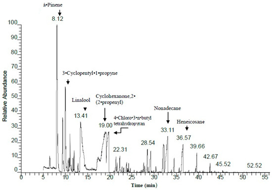 After headspace injection, the volatile organic components in the rose samples were detected quickly by heating them directly. By analyzing the gas-phase ion migration spectra and fingerprint chromatograms, the instrument can determine the differences between the volatile organic compounds in each sample. Based on the percentage of the relative peak area, all identified components were quantified. The compounds were tentatively identified based on a comparison of their relative retention times and mass spectra with NIST and Wiley library data obtained from the GC-MS system [38]. An example of GC-MS analysis that we received from the laboratory is provided in Figure 2 and Table 2.