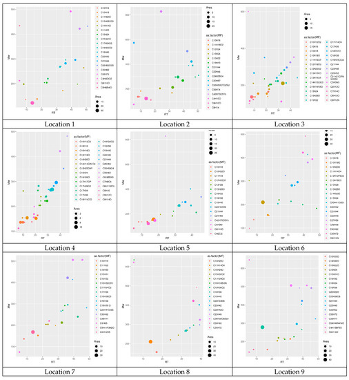 Bubble figures of RT vs. Mw for all of the locations. It is clear that Taif rose accessions are different in their oil composition characteristics.