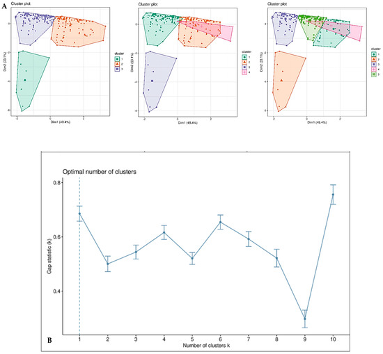 (A) Cluster analysis of the dataset provided and an assessment of how closely the different aspects of the datasets are matched. (B) Cluster gap analysis clarifies the optimal number of clusters and indicates that the optimal value is achieved when each location is placed in a separate cluster.