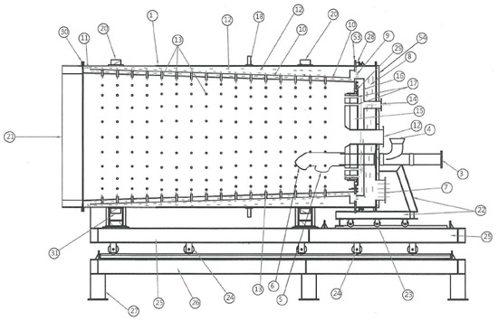 Several different combustion methods and concepts for adding fuel to the boiler appear on the market for biomass combustion equipment. Very important roles from the point of view of fuel combustion are played by the construction of the fireplace, the method of combustion, and the supply of combustion air and its division into the so-called primary and secondary combustion zones [14]. Solid fuel boilers are structurally different according to the type of fuel being burned. Grate fireplaces are used for burning lumpy solid fuels in a so-called calm layer [15,16], a process involving volumetric combustion that does not require fuel homogenization. On the other hand, fuels with a fine grain size are not suitable for burning on a grate [17]. Fuel combustion takes place both in the fuel layer and above its surface, when the volatile component of the fuel burns [18]. Combustion on a fixed, immovable grate is used mainly for small outputs. Fuel is placed in the fireplace from above on top of the burning layer and does not move during combustion on the grate [19]. The added fuel is ignited by the flame and the glowing surface of the burning fuel. An inclined grate allows for the occasional movement of the fuel and is composed of a fixed and a movable row of grates [20,21]. By reciprocating the sliding movement of movable grates along fixed grates, the fuel is transported further along the grate. Another variant of burners with a movable grate are rotary burners [22,23,24], where the combustion space is formed by a cylindrical surface in which the burning fuel is mixed with the supplied fuel and combustion takes place in the entire volume of the combustion chamber created in this way, as, e.g., in patent application no. KR101426660 B1 [25], the principle of which is shown in the Figure 1.
