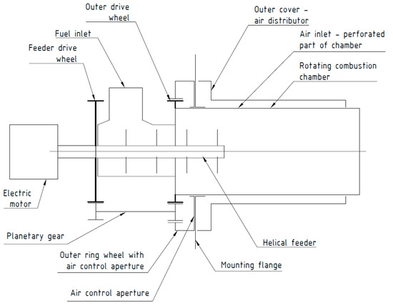 This method is also used in our proposed design. At the same time, the supplied air is divided, and part of it is led through the outer cover, which serves as an air distributor. Here, the air is not supplied statically, as in a similar burner from some manufacturers, where the air supply moves together with the combustion chamber. Our designed burner uses a planetary gear that transmits power from the electric motor to drive the fuel feeder, rotate the cylindrical combustion chamber, and rotate the air-control aperture.
