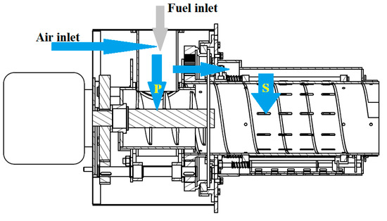Air flow in proposed burner (P—primary air, S—secondary air).
