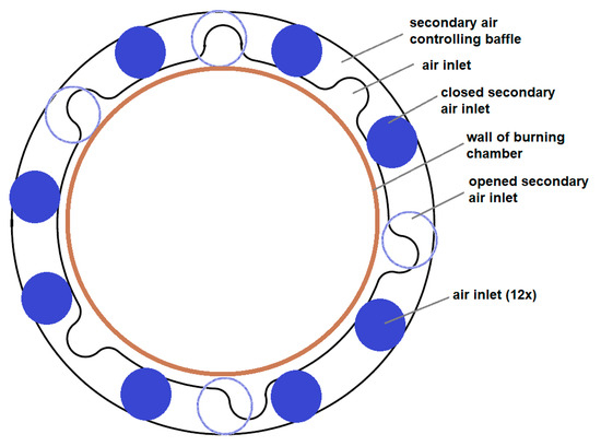 The newly designed burner combines the advantages of existing devices with suitable novel features to enable the desired combustion parameters to be achieved. The secondary air is led through the burner housing via the secondary-air-controlling aperture baffle, which ensures the distribution of air into the secondary-air inlet, which is formed by openings on the cylindrical combustion chamber. The design is shown in Figure 4.