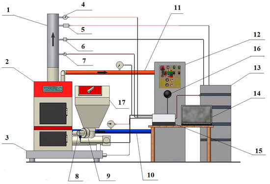 Furnace experiment setup. 1—chimney; 2—automatic pellet boiler; 2—weight; 3—chimney draft sensor; 4—PM probe (solid pollutants); 6—emissions probe; 7—thermometer for measuring flue gas; 8—anemometer; 9—fan; 10—supply pipe; 11—drainage pipe; 12—control center; 13—flue gas analyzer; 14—computer; 15—measuring station; 16—Vernon thermometer; 17—fuel tank.