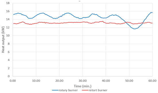 The average heat output of the rotary burner was higher than the heat output of the retort burner by approximately 1.5 kW, but the thermal efficiency of combustion was a little lower, namely by approximately 1%. This could be caused by our novel construction, which could be optimized for greater thermal efficiency in the future, but the achieved combustion efficiency values are close to those of other similar heat sources in a rotary burner [26]. Typical time courses of the heat output of the heat source in retort and rotary burners from our experiments are shown in Figure 6. The time course of the retort burner was more constant-stable and reached values of between 12.5 and 13.5 kW during the experiments. In contrast, the heat output of the rotary burner varied during the experiments, with values of between 11.5 and 16 kW. This variation was caused by the changing amounts of burial and burning wood pellets in the combustion space—at one moment there was little burning fuel and at the next more. It was manifested in the obvious fluctuations in the temperature of the flue gases, a change in the heat removed through the hot-water heat exchanger, and subsequently also in the production of emissions. This problem could be solved by changing the method of dosing fuel into the burner space—a more continuous supply of pellets in smaller and more frequent doses. The long response time between the change in heat output and the subsequent supply of fuel can also be a problem.