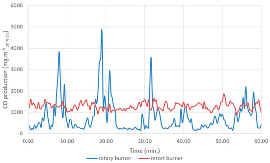 Figure 7 shows the typical time courses of CO emissions from the same heat source in both rotary and retort burners during the experiments. The characteristics of these time courses are very similar to the time courses of the heat output—CO production from the retort burner was more stable, not changing much over time and reaching values of around 1000–1400 mg.m−310% O2. CO production during use of the rotary burner was much more variable and reached values of from 100 to 5000 mg.m−310% O2. This was related to variable fuel metering as well as uneven heat output. Paradoxically, the average CO production was lower for the rotary burner by approximately one third, namely by 380 mg.m−310% O2. Our novel design for a rotary burner needs more optimization because similar wood pellet heat sources achieve production of CO emissions at the level of tens to hundreds mg.m−310% O2 [27] and lower, being classified as Emission Class 5 according to the STN EN 303-5 standard and Commission Regulation (EU) 2015/1189—500 mg.m−310% O2 for automatic heat sources for wood biomass.