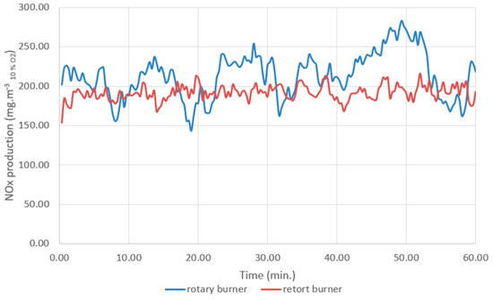 Typical time courses of NOx emissions from experiments on the retort and rotary burners are shown in Figure 8. Similar to the previous cases, the course of NOx production is more variable when using a rotary burner. The average measured NOx production values for the rotary burner were approximately 12.5% higher than the measured values for the retort burner. These slightly higher values could be due to the higher temperature in the combustion chamber due to the higher amount of supplied air, which was partially preheated. These values do not deviate from the usual values for similar heat sources [26,27]. The measured average values of NOx are bordering on or just above the required limit set by Commission Regulation (EU) 2015/1189—200 mg.m−310% O2 for automatic heat sources for wood biomass. This higher NOx concentration needs to be solved in our novel design for a rotary burner by construction modification to achieve a lower combustion temperature in the combustion area of the burner.