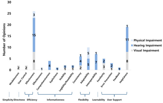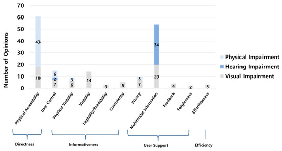 All of the opinions collected through the FGIs were grouped according to their similarities, organized, and classified overall into 78 items; we classified 33 and 45 items as related to accessibility and usability, respectively. Overall, the items that were related to visual and physical impairments were derived the most and least, respectively (Figure 2). Accessibility was derived in the order of visual, physical, and hearing impairments, and usability was derived in the order of hearing, visual, and physical impairments.