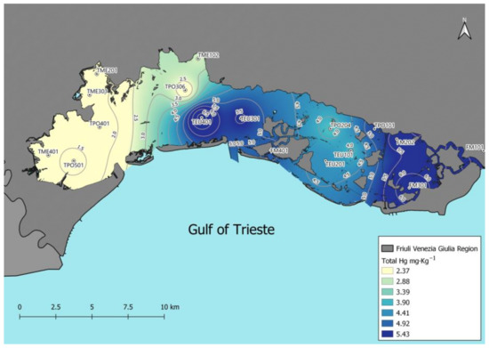 Total Hg was 3.94 ± 2.01 mg kg−1 (mean ± s.d.) and displayed a high degree of variability ranging from 1.30 to 7.35 mg kg−1 (at TPO5 and FM1, respectively). The spatial distribution showed a clear positive gradient moving eastward (from Marano to Grado basin) and also a significant enrichment in the central sector (TEU4 = 6.66 mg kg−1) (Figure 2). These results confirm the evidence reported by Acquavita et al. [26] (mean = 4.62 mg kg−1), where a comprehensive historical dataset (n = 178) was mapped, and, overall, the results of previous studies conducted at different sites of the same lagoon [26,30,36,39,69,70,71]. It should be noted that these results were two orders of magnitude higher than the Hg natural background (0.13 ± 0.04 mg kg−1) calculated by investigation in deep cores (n = 13; more than 1 m of depth) collected throughout the basin [35].