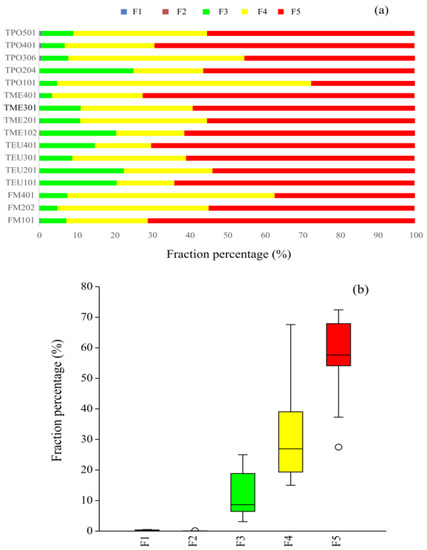 As aforementioned, the percentages of the fractions extracted differed significantly (K-W: p(same) = 4.99 e−15). However, a significant correlation was found for F1/F2 (r = 0.05329), F3/F4, and F4/F5 (r = 0.0667 and 0.08975, respectively). Unfortunately, there were no data on secondary parameters such as grain size and organic matter (Corg) to check the occurrence of significant correlations with the single fractions detected.
