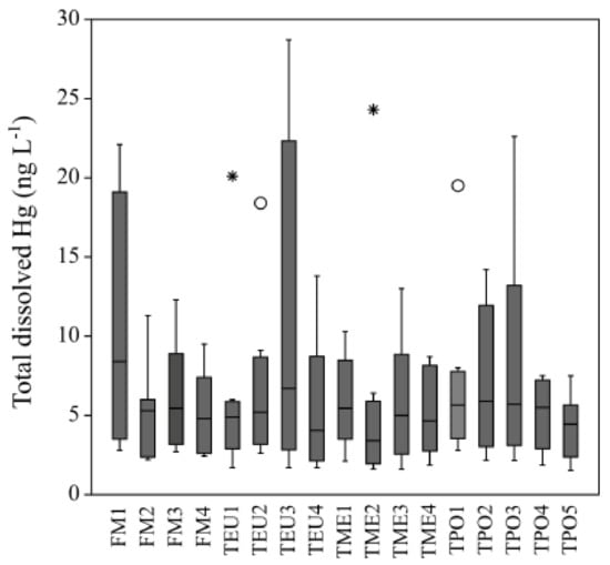 Total dissolved Hg in the water bodies of the Marano and Grado Lagoons. The box and whisker plot representation was used to display the median, 25th and 75th percentiles and the presence of outliers. The whiskers are drawn from the top of the box up to the largest data point less than 1.5 times the box height from the box (the “upper inner fence”), and similarly below the box. Values outside the inner fences are shown as circles, values further than 3 times the box height from the box (the “outer fences”) are shown as stars.