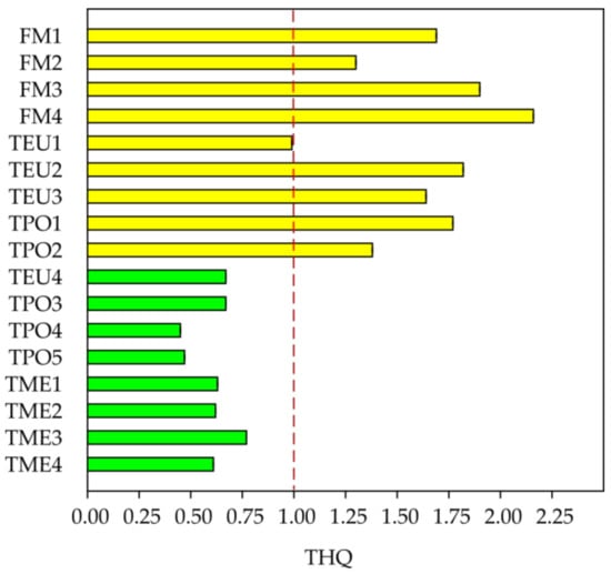 THQ showed a wide range of variability, ranging from 0.45 to 2.16 (at TPO4 and FM4, respectively). In detail, the WBs located in the Marano basin always displayed values < 1, whereas in the Grado basin are generally >1 (Figure 6).