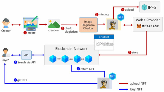 The proposed system has two flows: one from creators who upload NFT images, represented by the red line, and one from users who download or purchase NFT images, represented by the blue line, as shown in Figure 1. The proposed solution addresses the issues of combining all anti-plagiarism-related tasks into a single procedure and ensuring security and privacy protection. A decentralized app with all the capabilities and services, including anti-plagiarism and advanced application programming interface (API), is included in the proposed solution.