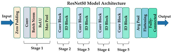 ResNet, also directed to as the Residual Network, is a type of convolutional neural network (CNN) that was invented by He et al. [29] in 2015. CNNs are frequently used by applications that employ computer vision (CV) [30]. ResNet-50 is a 50-layer convolutional neural network that comprises 48 convolutional layers, one intermediate pool layer, and one MaxPool layer. These residual neural networks are artificial neural networks (ANNs) that are constructed using residual blocks. Figure 4 illustrates the ResNet50 model architecture.
