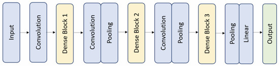 A DenseNet [31] is a type of convolutional neural network (CNN) that employs dense connections amid layers via dense blocks. In this architecture, all layers with matching feature-map sizes are directly linked to one another. To maintain the feed-forward essence of the system, each layer receives additional information from all preceding layers and transmits its own feature maps to all subsequent layers. The downsampling of layers, which modifies the dimension of feature maps, is a crucial component of convolutional networks. Figure 5 depicts the division of the network into several densely coupled dense blocks in the DenseNet architecture to facilitate downsampling. The convolution and pooling layers amid blocks are referred to as transition layers.