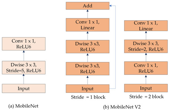 The initial support for the MobileNet model was provided by depthwise separable convolutions, which is a type of factorized convolution that splits a standard convolution into a depthwise convolution and a convolution commonly known as a pointwise convolution [32]. In contrast, MobileNetV2 features two distinct block types, with one having a stride of one and the other being a shrinking block with a stride of two. Both block types consist of three separate tiers. The first layer in this model is a convolution with ReLU6, followed by a depthwise convolution, and then a convolution with no non-linearity. It is noted that deep networks only have the classification ability of a linear classifier in the non-zero volume part of the output domain if ReLU is reapplied. Figure 6 depicts the MobileNetV2 model architecture and a comparison to MobileNet [33].