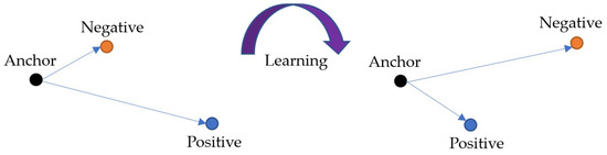 Triplet Loss trains a neural network to maximize the distance between embeddings of different classes while ensuring that embeddings of the same class are closely grouped together. This is achieved through selecting an anchor sample, along with a positive and negative sample [44]. This triplet loss aims to guarantee that a picture of a certain entity is closer to all other images of that entity than it is to any image of any other entity. Figure 8 illustrates this.