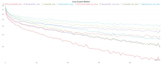 Additionally, Table 2 displays the loss and validation loss and the training time results for all four models. The MobileNetV2 model’s training time was the shortest at 222.148 min, while the EfficientNet-B0 model’s training time was the longest at 230.379 min. MobileNetV2 has a smaller structure with a size of 14 MB and a depth of 105, whereas EfficientNet-B0 has a structure size of 29 MB and a depth of 132 [46]. Therefore, based on model architecture, EfficientNet-B0 has a larger and more complex model than the other models, with more parameters and layers. This model can increase the training time as more computations are required to update the weights and biases of the model. Furthermore, the EfficientNet-B0 model is designed to handle larger images and batch sizes than the other models, which can raise the training time [47].