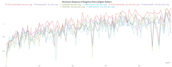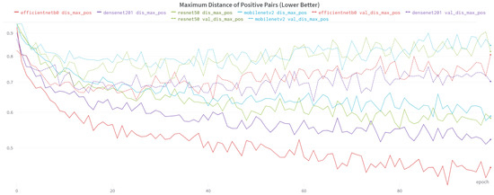 Figure 10 illustrates the EfficientNet-b0 model with the lowest maximum distance of positive pairs, which is represented by the red line, followed by DenseNet with the purple line, ResNet50 with the green line, then MobileNetV2 with the blue line, respectively. While the lowest validation maximum distance of positive pairs was achieved by DenseNet with a purple dashed line, then followed by EfficientNet-B0 with a red dashed line, ResNet50 with a green dashed line, then MobileNetV2 with a blue dashed line subsequently.