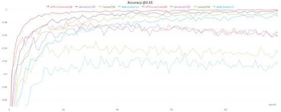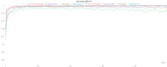 Comparison of the accuracy among ResNet50, DenseNet, MobileNetV2, and EfficientNet-B0 with a threshold score of 0.75.