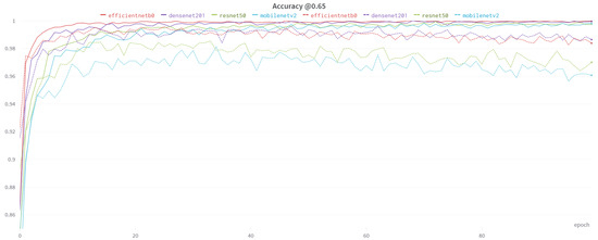 Comparison of the accuracy among ResNet50, DenseNet, MobileNetV2, and EfficientNet-B0 with a threshold score of 0.65.