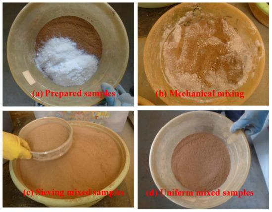 The NS (procured commercially) suspended on the surface when the mixed sample was obtained by the ordinary mechanical stirring and mixing method. In order to obtain the uniform soil sample, in addition to the mechanical mixing method, the mixed soil sample passed through a 2.5 mm sieve many times (Figure 2) [26]. The specific operation process was: (1) a certain amount of soil samples and NS were placed in a container and mixed with a mechanical method (Figure 2a); (2) the mixture of soil samples and NS (NS particles still suspended on the surface of soil samples) was split and placed in a 2.5 mm sieve (Figure 2b); (3) the mixed samples were sieved according to the normal sieving process until no small particles were left in the sieve, and the aggregates were crushed until no white powder was visible (Figure 2c); (4) coarse and fine particles were re-mixed in another container, and the above steps (2) and (3) were repeated until all soil samples were mixed; (5) the mixed soils from step (4) were passed through a 2 mm sieve; (6) steps (2)–(5) were repeated until the white powder was no longer present in the soil sample, and a uniform mixed sample was obtained (Figure 2d). In this study, four NS contents were added to modify Qinghai–Tibet Plateau silty clay, namely 0, 0.25, 1, and 3 percent.