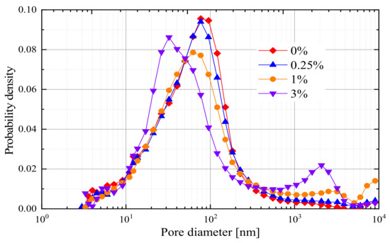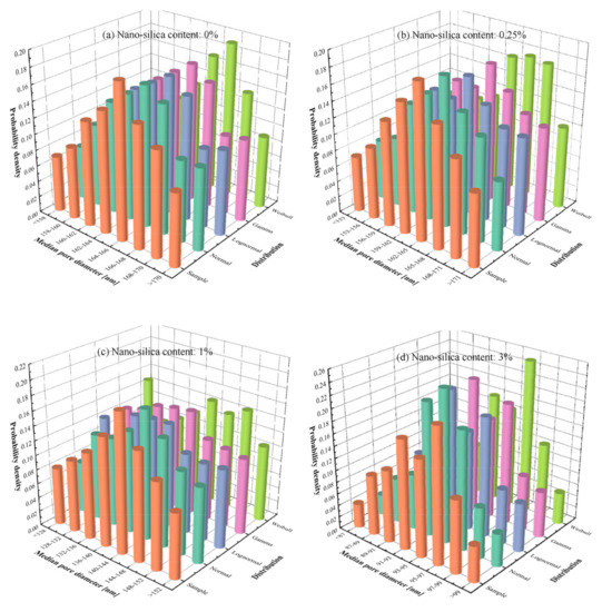As a porous medium, the soil–water system consists of soil particles, a pore solution, and air, making a four-component medium with the incorporation of NS. The four components are approximately arranged according to a certain regularity (the center to outer layers are the soil particles, NS particles, or pore solution, and air, respectively) [32,33]. However, the sizes, shapes, and mineral components of the soil particles are various due to geological and environmental processes [34]. The surface of soil particles or the voids of soil–water systems are randomly filled with water, NS particles, and air. Therefore, even at the same NS addition, the microstructures of fifty NS-modified Qinghai–Tibet silty clay specimens show significant randomness and variability (Figure 5 and Figure 6). For instance, compared to the minimum median pore diameter of each NS addition, the range abilities for NS contents of 0, 0.25%, 1%, and 3% are 10.05%, 19.14%, 26.17%, and 16.69%, respectively. Similarly, the range abilities of for NS contents of 0, 0.25%, 1%, and 3% are 21.89%, 16.72%, 25.28%, and 14.50%, respectively.