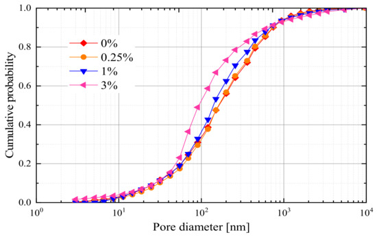Figure 4 shows the accumulated pore radius distribution curves of NS-modified Qinghai–Tibet silty clay. According to the average pore diameter classification standard from the International Union of Pure and Applied Chemistry (IUPAC) [31], the boundary diameter of meso- and macro-pores is 50 nm. Meanwhile, the size of the NS particles used in this study was about 15 nm. Therefore, 50 nm and 150 nm were selected as the boundary diameters of small pores, medium pores, and larger pores. From Figure 5, the volume content of larger pores was 52.53%, and the medium and smaller pores of the plain silty clay were 29.93% and 17.54%, respectively. The volumetric content of the medium pores increased to 31.59%, 35.83%, and 46.59% for the NS additions of 0.25%, 1%, and 3%, respectively. The volume of the macro-pores, on the other hand, decreased from 52.53% to 33.10% when the NS particle content increased from 0 to 3%, and the volumetric content of the smaller pores had little change with the addition of NS. In general, a small quantity of addition was not enough to fill the void of soil–water systems directly. However, due to the strong water absorption of NS, the voids may be filled by small clay clusters formed with NS as the core.