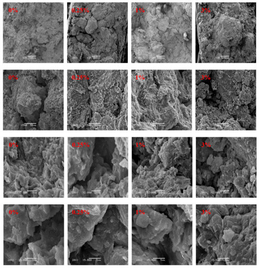 To examine the effect of NS on the microstructure of modified Qinghai–Tibet silty clay, four addition contents were selected for SEM imaging at various magnifications (×35, ×500, ×2000, ×5000) (Figure 7). Figure 7 shows that the microstructure is quite loose and some large voids are in the soil–water system in the plain silty clay without NS. It can be seen that the microstructures become intact by adding only a small amount of NS, but there are many median voids forming. Moreover, as shown in Figure 7, the microstructures become compact and dense with the increment in NS addition. The micro-pore changes show that the NS could effectively densify the microstructure, compared to the plain silty clay. Microstructure densification may be attributed to the voids between the soil grains filled successively. These SEM research results agree with the conclusion of the aforementioned void analysis.