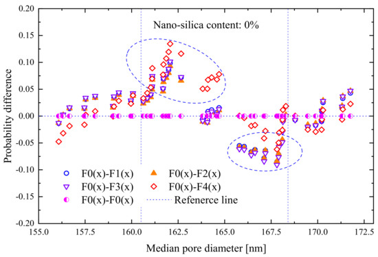 In this study, the microscopic characteristics of NS-modified Qinghai–Tibet silty clay were described using two microporous parameters, including median pore diameter and . Figure 8 shows the probability differences between the potential probability distributions and the measured median pore radii at four NS contents (the additions with 0.25%, 1%, and 3% are in Figure S1). These probability differences have small values, indicating that the measured data are similar in shape to the four potential probability distribution curves. Nevertheless, 13.45% is the largest probability difference of the median pore size for the Weibull distribution without addition, which deviates from the measured results (Figure 8).