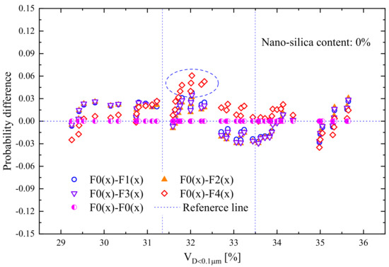 The measured mean curves at four NS contents are compared with the four distributions, and the probability differences between the probability distributions and experimental are shown in Figure 9. Similarly, the largest of the probability difference of for the Weibull distribution reaches 0.1827 with the addition of 0.25%, which deviates relatively from the measured results (Figure S2). The comparison results indicate that the probability law of mean cannot be reflected through the Weibull distribution. However, the other three types of distribution and measured results are in good agreement, the largest probability difference between the three distributions and measured results are smaller than 10.32%, except for the addition of 1%. The comparison results indicate that the randomness and variability are significant for the microstructure characteristics of modified Qinghai–Tibet silty clay. Therefore, the mean of NS-modified Qinghai–Tibet silty clay follows normal, lognormal, or Gamma distributions.