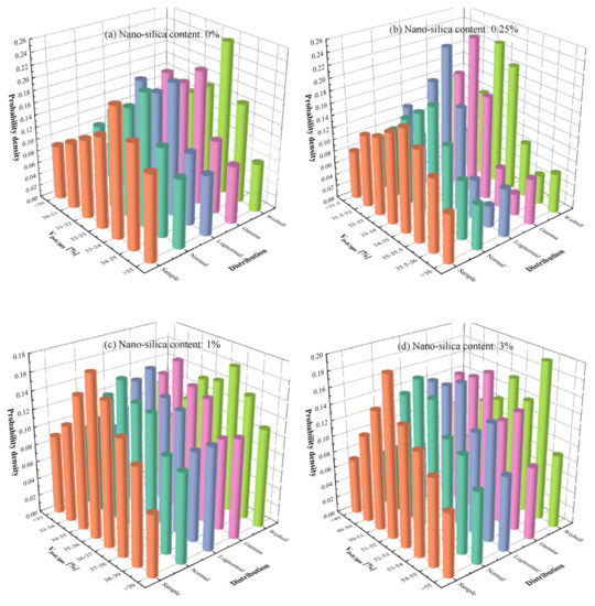 In this part, the possible value range of the cumulative volume of pore size smaller than 0.1m is divided into seven or eight intervals. The distribution laws of potential probability distributions and measured at four NS additions are shown in Figure 11. When the NS additions are 0, 0.25%, 1%, and 3%, the corresponding maximum probabilities of measured are in the intervals of 33~34%, 34~35%, 35~36%, and 51~52%, respectively. Additionally, the probabilities are 0.21, 0.17, 0.18, and 0.20, respectively. In general, for the , the distribution law of normal distribution has a high similarity with the sample distribution. However, the lognormal, Gamma, and Weibull distributions are different from the sample distribution law, especially the Weibull distribution.