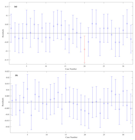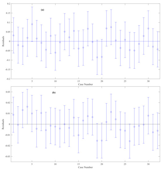 Figure 14 and Figure 15 show the residual plot of microstructure parameters estimated by the normal distribution and information spread estimation (from left to right: the plots of 1 to 8, 9 to 16, 17 to 24, and 25 to 32 were from silty clays with NS contents of 0, 0.25%, 1%, and 3%, respectively). From Figure 14a, the 20th residual plot of normal distribution is singularity, and the residuals of normal distribution are greater than those of the information spread estimation in Figure 15. Therefore, the information spread estimation has a better fitting effect than the normal distribution for the NS-modified silty clay, because it has combined the normal distribution information of each observation. Meanwhile, the information spread estimation fits with all observations with the nonlinear regression method.