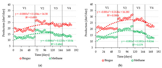 Other researchers have also reported that SCO2 pre-treatment significantly affects biogas production and CH4 content. The difference was the most pronounced within the OLR range of 3.0–4.0 gVS/dm3·day and extended both to the output of gas metabolites and the CH4 fraction. The study has also shown OLR to have a significant effect on these values. The highest daily yields from AD were recorded at 3.0 gVS/dm3·day (V2). S1 produced 17.7 ± 0.8 dm3 CH4/day, compared to 20.4 ± 1.1 dm3CH 4/day determined in S2.