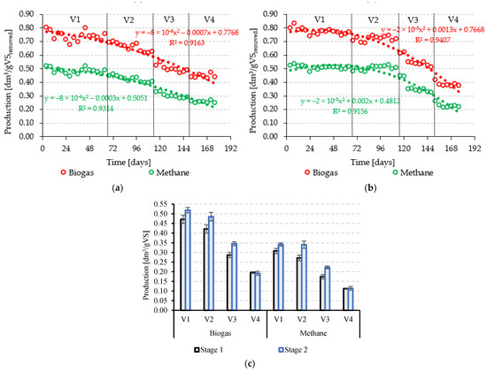 Daily biogas and CH4 yields per VSin and VSout significantly decreased as the OLR increased. In S1, biogas yields varied from between 0.47 ± 0.02 dm3/gVS and 0.74 ± 0.04 dm3/gVSremoved (V1) to 0.20 ± 0.01 dm3/gVS and 0.45 ± 0.01 cm3/gVSremoved (V4) (Figure 4a). The range for S2 was from 0.52 ± 0.01 dm3/gVS and 0.19 ± 0.01 cm3/gVSremoved (V1) to 0.77 ± 0.02 dm3/gVS and 0.39 ± 0.01dm3/gVSremoved (V4) (Figure 4b). In terms of the CH4 fraction produced, the most pronounced differences were noted in V2, with 0.52 ± 0.03 cm3/gVSremoved in S2V2 and 0.42 ± 0.02 cm3/gVSremoved in S1V2 (Figure 4a,b). The average CH4 contents show that the pre-treatment successfully boosted performance in the whole stage. The average for S1 was 0.22 ± 0.01 dm3/gVS and 0.37 ± 0.02 cm3/gVSremoved, whereas S2 produced 0.25 ± 0.01 dm3/gVS and 0.40 ± 0.02 cm3/gVSremoved (Figure 4c).