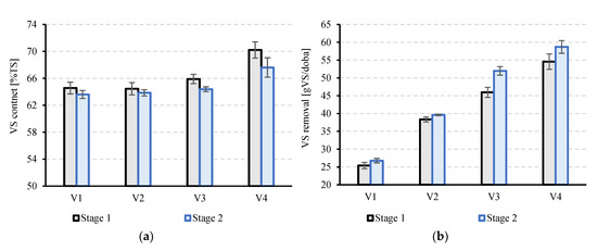 Stage V1 and V2 produced the lowest levels of VS in the digestate. The levels for S1 were 64.6 ± 0.9% TS and 64.5 ± 0.8% TS, respectively. The S2 digestate contained 63.6 ± 0.6% TS (V1) and 63.9 ± 0.7% TS (V2) (Figure 5a). Increasing OLR to 5.0 gVS/dm3·day led to significantly higher rates of VS in the digestate, i.e., 70.2 ± 1.2% TS in S1 and 67.6 ± 1.4% TS in S2 (Figure 5a). There was a positive linear relationship between the OLR and VS removed. The biodegradation rate in S1V1 was 25.4 ± 0.2 gVS/day, which corresponded to 63.3% of the initial load (Figure 5b). Similarly, the mineralization rate in S2V1 was 67.1%, which translated to 26.8 ± 0.4 gVS removed per day (Figure 5b). At an OLR of 5.0 gVS/dm3·d (V4), the removal rates were 54.6 ± 1.2 gVS/day (43.4%) in S1 and 58.7 ± 1.3 gVS/day (47.9%) (Figure 5b). The VS mineralization rate was somewhat affected by the pre-treatment with SCO2, but OLR was the main determinant.