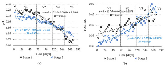Trends in pH value (a) and FOS/TAC ratio (b) throughout the experiment.