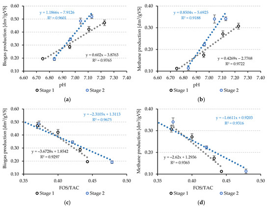 The pH and FOS/TAC were found to correlate with the OLR. The pH showed a consistent negative correlation with organic matter levels and a positive one with HRT. Both stages showed a near-neutral pH (7.23 ± 0.04–6.96 ± 0.03) as long as OLR was maintained within 2.0–4.0 gVS/dm3·d (Figure 6a). An increase in OLR to 5.0 gVS/dm3·d triggered significant decreases in pH—6.75 ± 0.05 in S1 and 6.84 ± 0.03 in S2 (Figure 6a). Similarly, the highest tested OLR (V4) led to elevated FOS/TAC at 0.44 ± 0.02 (S1) and 0.48 ± 0.02 (S2) (Figure 6b). Such values are indicative of digester overload. The FOS/TAC ratio in variants V1–V3 ranged from 0.37 ± 0.02 to 0.43 ± 0.02 in S1 and from 0.33 ± 0.03 to 0.42 ± 0.01 in S2 (Figure 6b). In both stages, very strong positive correlations were found between the pH and biogas and methane production yields. The coefficients of determination reached R2 = 0.9765 and R2 = 0.9722 in S1 (Figure 7a,b) and R2 = 0.9601 and R2 = 0.9188 in S2 (Figure 7a,b). Similarly, very strong but negative correlations were found between FOS/TAC and biogas (R2 = 0.9287) and methane (R2 = 0.9365) yields in S1 (Figure 7c,d) and R2 = 0.9675 for biogas (Figure 7c) and R2 = 0.9316 for methane in S2 (Figure 7d).