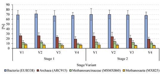 The composition of the anaerobic bacterial community over time was not significantly affected by the SCO2 pre-treatment. However, the abundance of methane-producing Archaea was indeed affected by the highest OLRs used in V3 and V4. With OLR at 2 to 3 gVS/dm3·day, the share of Archaea exceeded 24% in both stages (Figure 8). When the OLR range was 4 to 5 gVS/dm3·day, the proportion fell to 19–23% in S1 and 19–21% in S2 (Figure 8). Similar trends were found for Methanosarcinaceae (MSMX860). On the other hand, no relationship was found between the variant used and the abundance of Bacteria (EUB338) and Methanosaeta (MX825). The share of Bacteria in the community ranged from 68 ± 7% to 71 ± 8%, whereas that of Methanosaeta (MX825) accounted for 6 ± 2% to 8 ± 2% (Figure 8).