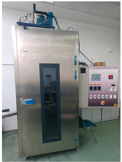 The compartment to be cooled has been designed with optimum dimensions for its location within the laboratory, being a basic premise for the construction of the plant and following techniques typical of industrial plants. Its measurements are 1.20 m × 1.20 m × 2.50 m, and it consists of a 0.90 m × 2.00 m door with a climalit glass viewer in order to observe the interior of the enclosure without accessing it while experiments are being rehearsed. The set is supported on a base with wheels to facilitate its transfer. The material used for its construction is 75 mm thick sandwich-type modular panels formed on the inside with pre-lacquered sheet metal with an epoxy resin finish, with expanded polyurethane-based insulation on the inside and a stainless steel sheet on the outside. The modular panels are tongue and groove, reinforcing their union with hooks to guarantee their tightness.
