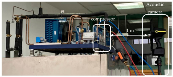 A refrigeration chamber will be used to measure the noise emissions and the sound quality using different refrigeration gases under control conditions. The experimental system was designed on a refrigerating chamber including a semi-hermetic compressor model A 0.5 4Y (Frascold). Different operating points of the compressor have been evaluated at corresponding working pressures. Table 1 shows the specifications of the refrigerating system. The experimental rig of the refrigeration system can be seen in Figure 2. Each refrigerant tested was charged with the same mass, 1500 g, and previously, the compressor was also purged with nitrogen. All experiments were developed in a stable laboratory environment with a constant outside temperature of 25 °C.
