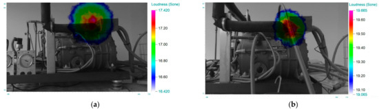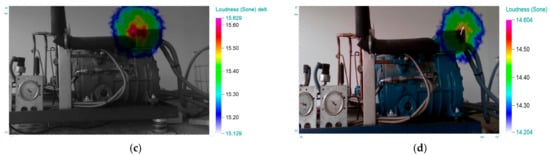 Figure 5 shows the loudness for both refrigeration gases with and without regulation system (Figure 5c,d and Figure 5a,b respectively). It is possible to observe how the level of loudness is lower using 134A refrigerant as well as when the system of control is working for both kinds of refrigerant. Moreover, the sound source in the refrigeration systems was identified close to the suction nozzle.