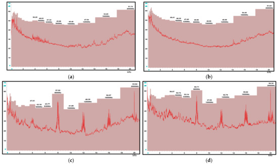 It is possible to observe that the maximum average spectrum (red continuous line in the spectrum) is achieved by R-449A (Figure 6). Additionally, the content of low frequencies is higher using this kind of gas, which could increase the annoyance. When the control system is working, the effect of the variable frequency drive (VFD) can be seen in the spectrum due to the peak of frequency at 8 kHz, 12.5 kHz, and 16 kHz corresponding to the working frequency of VFD.